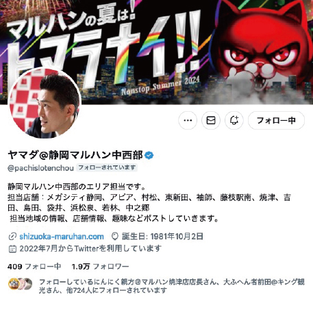 マルハン八王子四谷店から店長のキャリアをスタートさせた山田氏。その後、亀有店の店長を務め、業績を上げた後に新宿東宝ビル店の7代目店長に就任する。Xのアカウントを開設したのは、就任してから1年を過ぎた頃。アカウントを開設してから、店舗を離れるまでの約1年半、毎日ポストを欠かすことはなかった。同店での功績が認められ、静岡中西部エリア13店舗を束ねるエリア長に昇進。1万9000人以上のフォロワーを抱えており、「SNSの影響力が強い東京から、そうでない郊外に異動してどこまで変化させられるか。そういうチャレンジも含めた人事なのでしょう」とは本人談。