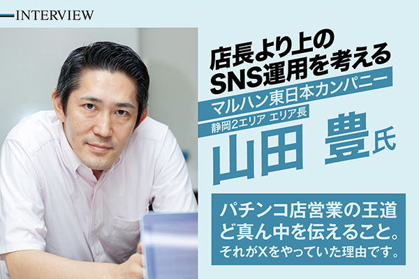 今年の2月20日、「退任のご挨拶」というXポストを出し、それをもってマルハン新宿東宝ビル店から卒業。新天地として静岡中西部13店舗のエリア長となった山田豊氏。店長時代には、1日も欠かすことなく毎日ポストを続け、アカウントと業績を成長させ続けてきた。店長という役職を離れエリア長となった今も、Xの運用は続いている。SNSもホールの業績も、両方の成功を収めてきた本人に、Xの運用軸からホール営業感まで含めて意見を求めた。